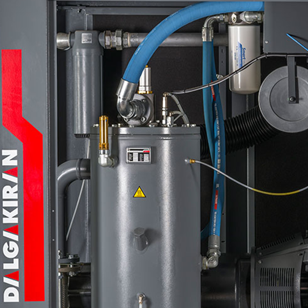 - В компрессорах Dalgakiran DVK D маслосепаратор вынесен отдельно, поэтому в процессе эксплуатации легко производить его замену.